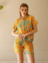 Bring a burst of sunshine to your loungewear with the Baga PJ Set. This tropical-inspired shirt and short set in vibrant yellow, crafted from soft light cotton, features a beautiful handblock print. A perfect slice of vacation, offering both comfort and style.