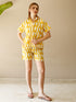 Unwind in style with the Dodo PJ Set. This relaxed shirt and short set, featuring a yellow abstract feather handblock print, is crafted from soft, light cotton. Perfect for lounging and relaxing, it combines effortless comfort with a touch of artistic flair.